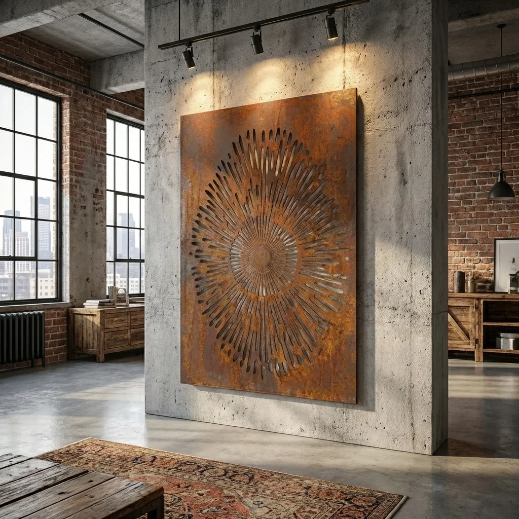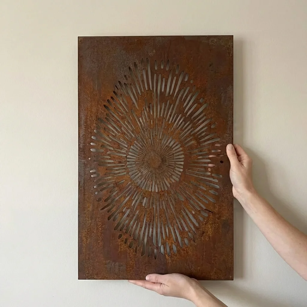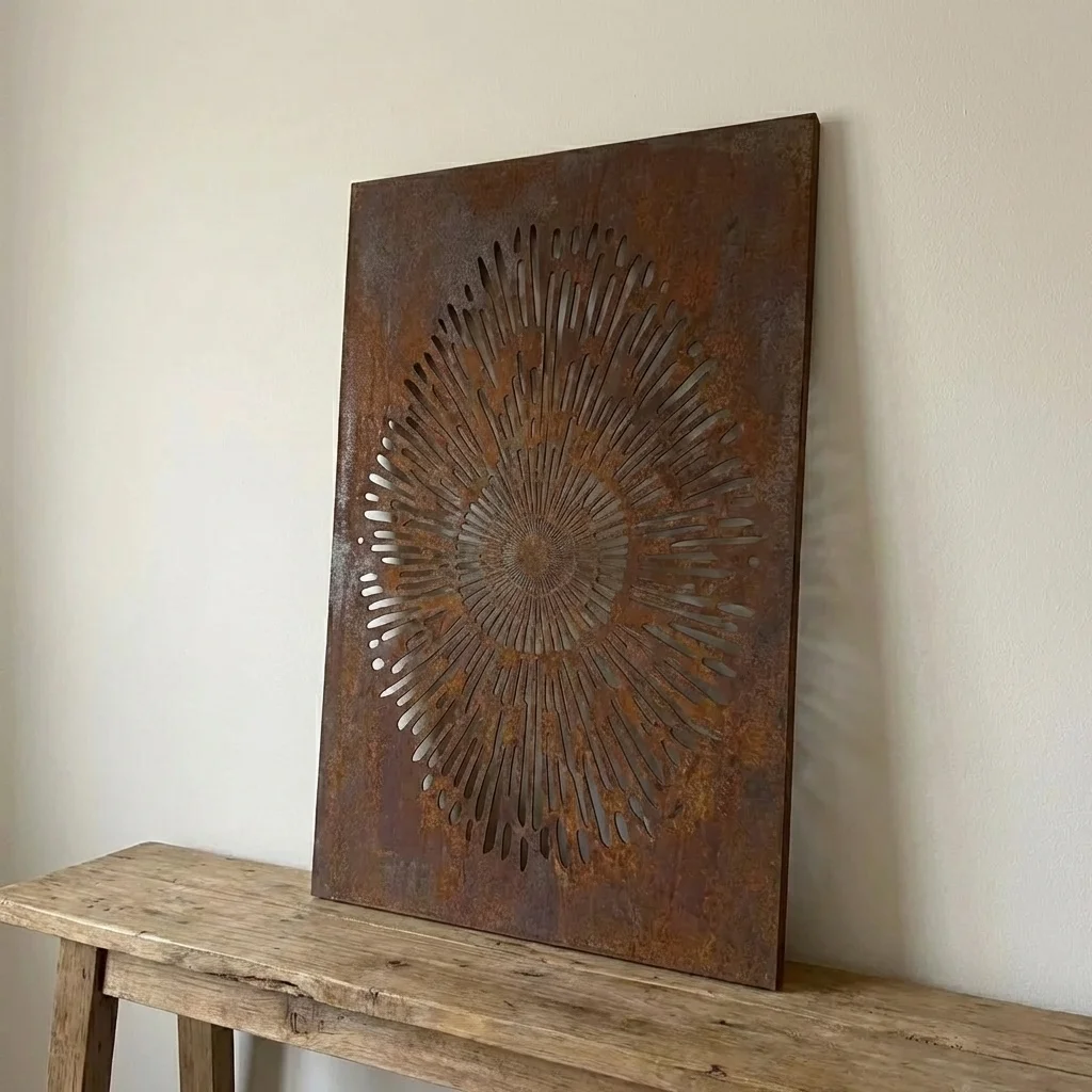Panel dekoracyjny metalowy „Cosmic Sun” – promienisty wzór jak słońce i efekt gry światła/cienia. Rozmiary: wys. 60/90/120 cm, szer. 40/60/80 cm. Wykończenia: Corten, stal malowana proszkowo (biała/czarna/złota) lub stal nierdzewna. Darmowa dostawa w Polsce.