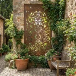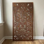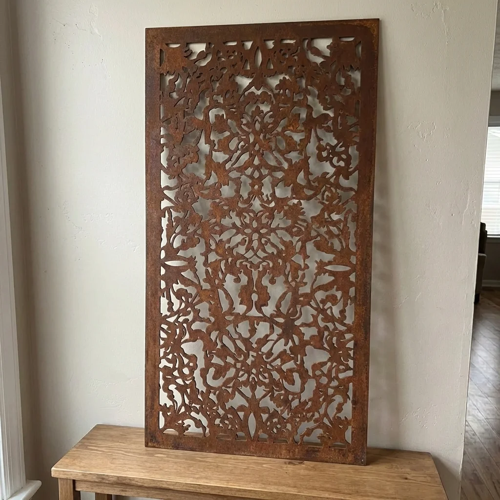 Floral Arabesque to metalowy panel dekoracyjny łączący ornament arabeski z delikatnym, florystycznym charakterem. Ażurowy wzór wygląda lekko, ale robi wyraźny efekt na ścianie – szczególnie przy oświetleniu, które podkreśla detale i tworzy subtelną grę cieni.