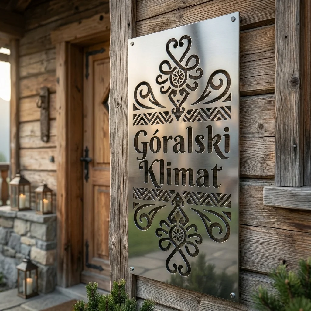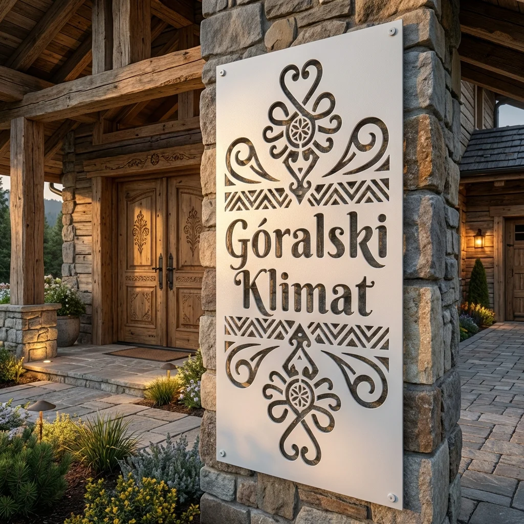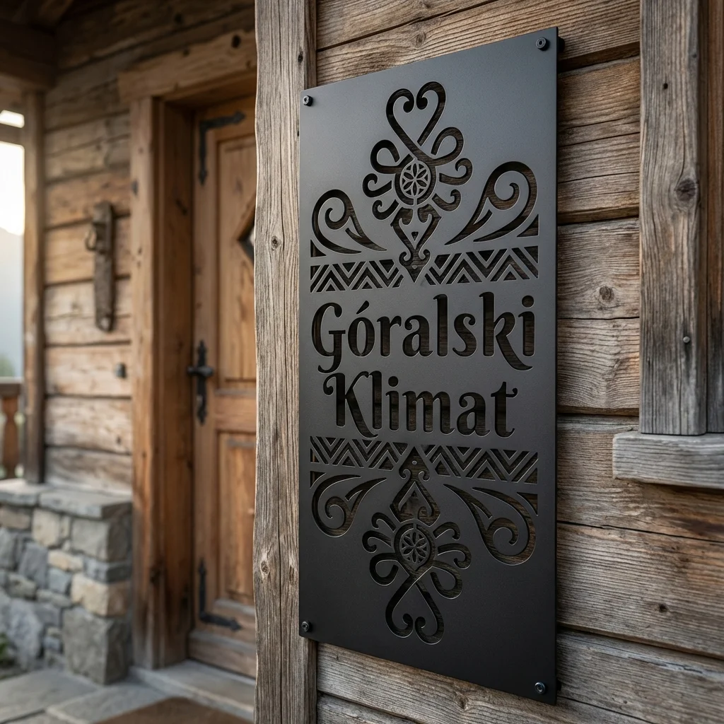 Panel dekoracyjny metalowy góralski – Góralski Klimat Parzenica to pionowa ozdoba ścienna z napisem oraz ornamentami inspirowanymi parzenicą i stylem Podhala. Doskonale pasuje do elewacji, ganku, altany, pensjonatu lub wnętrza z regionalnym akcentem. To dekoracja, która wnosi do przestrzeni wyrazisty i elegancki góralski klimat.