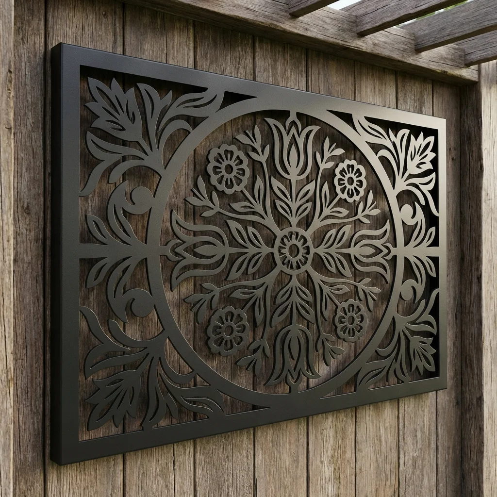 Panel dekoracyjny metalowy „Kaszubska Rozeta Kwiatów” to efektowna dekoracja ścienna z kaszubskim motywem rozety i kwiatowej symetrii. Idealna do wnętrz, na elewację, taras lub do ogrodu. Rozmiary: 35 × 27 cm, 50 × 38 cm, 75 × 57 cm. Wykończenia: corten, czarny, biały, złoty lub stal szczotkowana. Darmowa dostawa w Polsce.