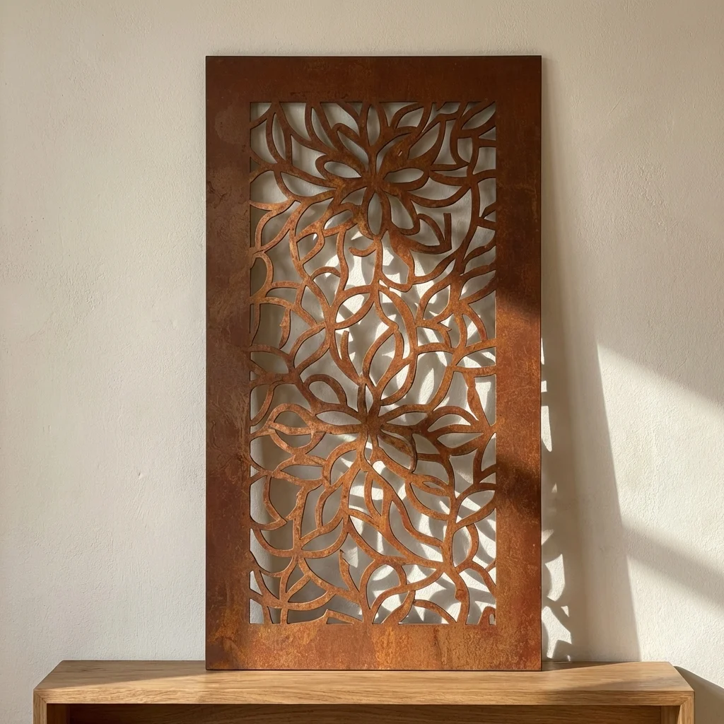 Panel Dekoracyjny Metalowy Kwiatowa Symetria to elegancka dekoracja ścienna z ażurowym wzorem inspirowanym kwiatami, liśćmi i harmonijną kompozycją. Pionowa forma pięknie podkreśla charakter stylowych wnętrz oraz zadaszonych stref wypoczynkowych. Darmowa dostawa na terenie Polski.