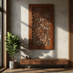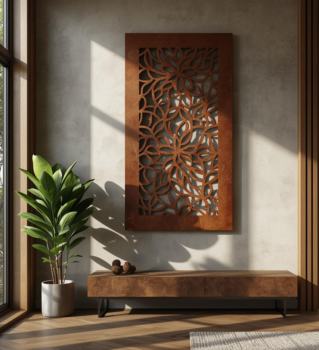 Elegancki panel dekoracyjny z motywem kwiatowej symetrii, wykonany z trwałej stali corten. Idealny do wnętrz oraz ogrodów, wprowadza harmonię i naturalne piękno.