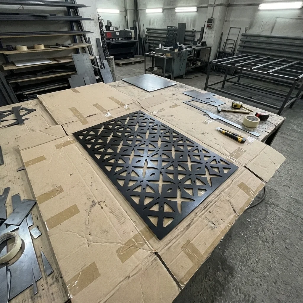 Panel dekoracyjny metalowy „Modern Grid” – geometryczna kratownica i efekt światła/cienia. Rozmiary: wys. 60/90/120 cm, szer. 40/60/80 cm. Wykończenia: Corten, stal malowana (biała/czarna/złota) lub stal nierdzewna. Darmowa dostawa w Polsce.