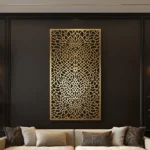 Panel dekoracyjny metalowy „Royal Mandala” ze złotym, symetrycznym wzorem inspirowanym mandalą. Elegancka ozdoba do wnętrz klasycznych i nowoczesnych.