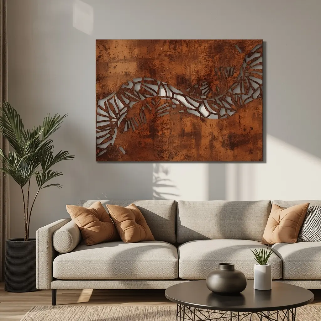 Panel Dekoracyjny Metalowy Rusty River to unikalna dekoracja o nowoczesnym charakterze. Dynamiczny wzór, który przypomina płynący nurt rzeki ułożony z geometrycznych fragmentów, nadaje aranżacji wyjątkowego klimatu i ruchu.