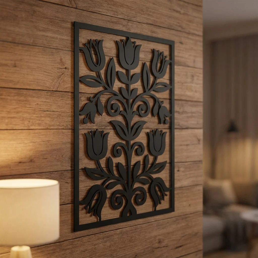 Panel dekoracyjny metalowy Tulipanowa Symetria to elegancka dekoracja ścienna inspirowana rytmicznym układem tulipanów i roślinnych ornamentów. Symetryczny, ażurowy wzór przyciąga wzrok i świetnie odnajduje się zarówno w klasycznych wnętrzach, jak i w nowoczesnych aranżacjach salonu, sypialni, holu, restauracji czy hotelowej recepcji.