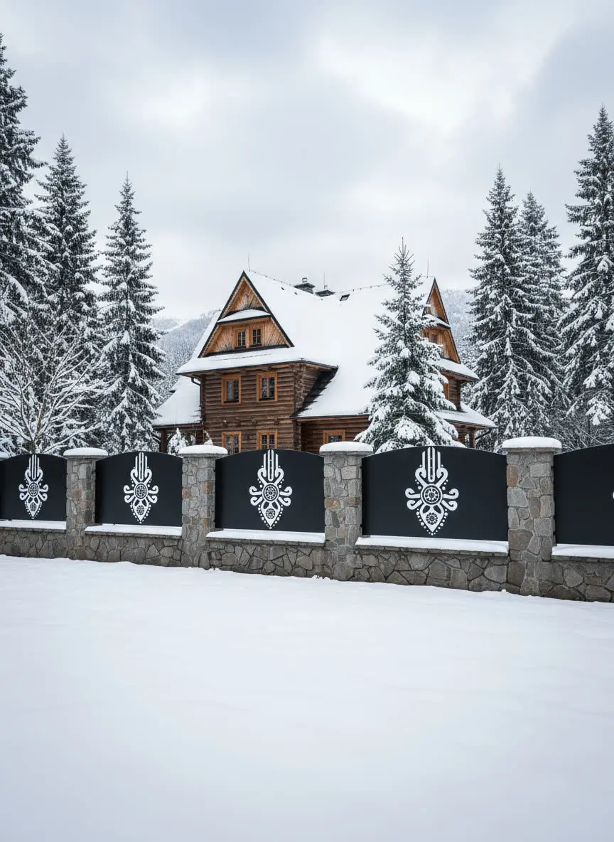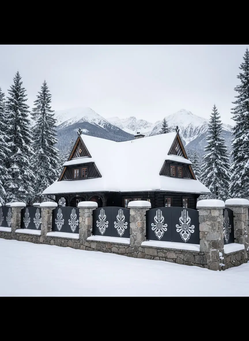 Nowoczesny panel ogrodzeniowy w stylu góralskim z laserowo wyciętym ornamentem inspirowanym tradycją Podhala. Idealny do posesji utrzymanych w regionalnym lub rustykalnym klimacie.