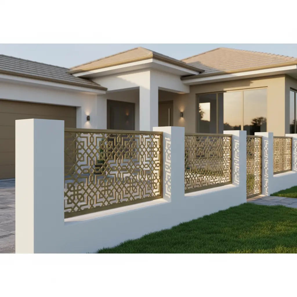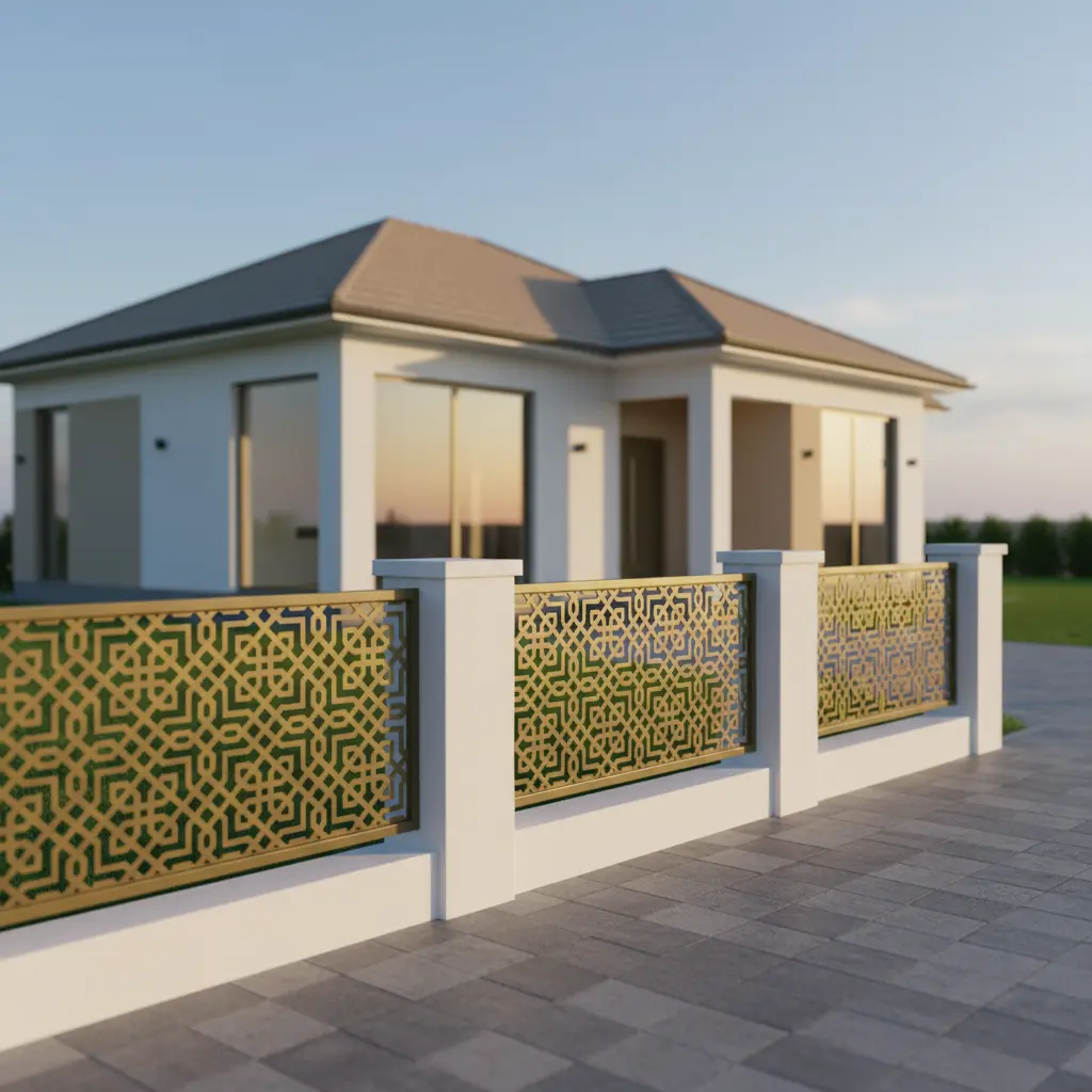 Panel Ogrodzeniowy Metalowy Geometria Złota to połączenie funkcjonalności i designu. Wykonany z wytrzymałej stali malowanej proszkowo, gwarantuje odporność na warunki atmosferyczne i wieloletnią trwałość. Geometryczny wzór inspirowany orientalnymi motywami nadaje panelowi luksusowy i nowoczesny wygląd, a złote wykończenie podkreśla prestiż i wyjątkowy styl posesji.