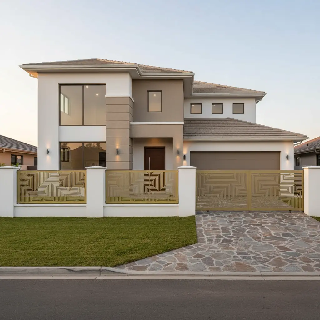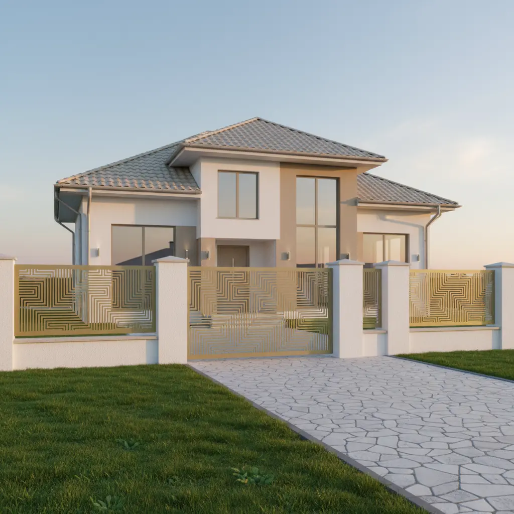 Dzięki precyzyjnemu cięciu laserowemu wzór jest niezwykle wyrazisty i nadaje posesji niepowtarzalny styl. Panel Labirynt Złoty świetnie komponuje się z nowoczesnymi budynkami o minimalistycznej bryle, tworząc harmonijną całość z architekturą oraz otoczeniem.
