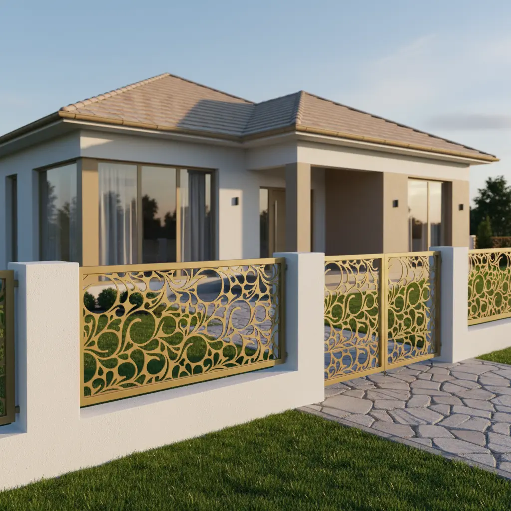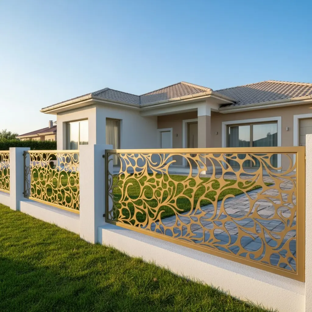 Wykonany z wysokiej jakości stali, malowanej proszkowo na złoto, panel jest odporny na warunki atmosferyczne i korozję. Dzięki precyzyjnemu cięciu laserowemu wzór jest niezwykle szczegółowy i trwały. To doskonała propozycja dla osób, które chcą nadać swojej posesji elegancki i nietuzinkowy charakter.