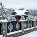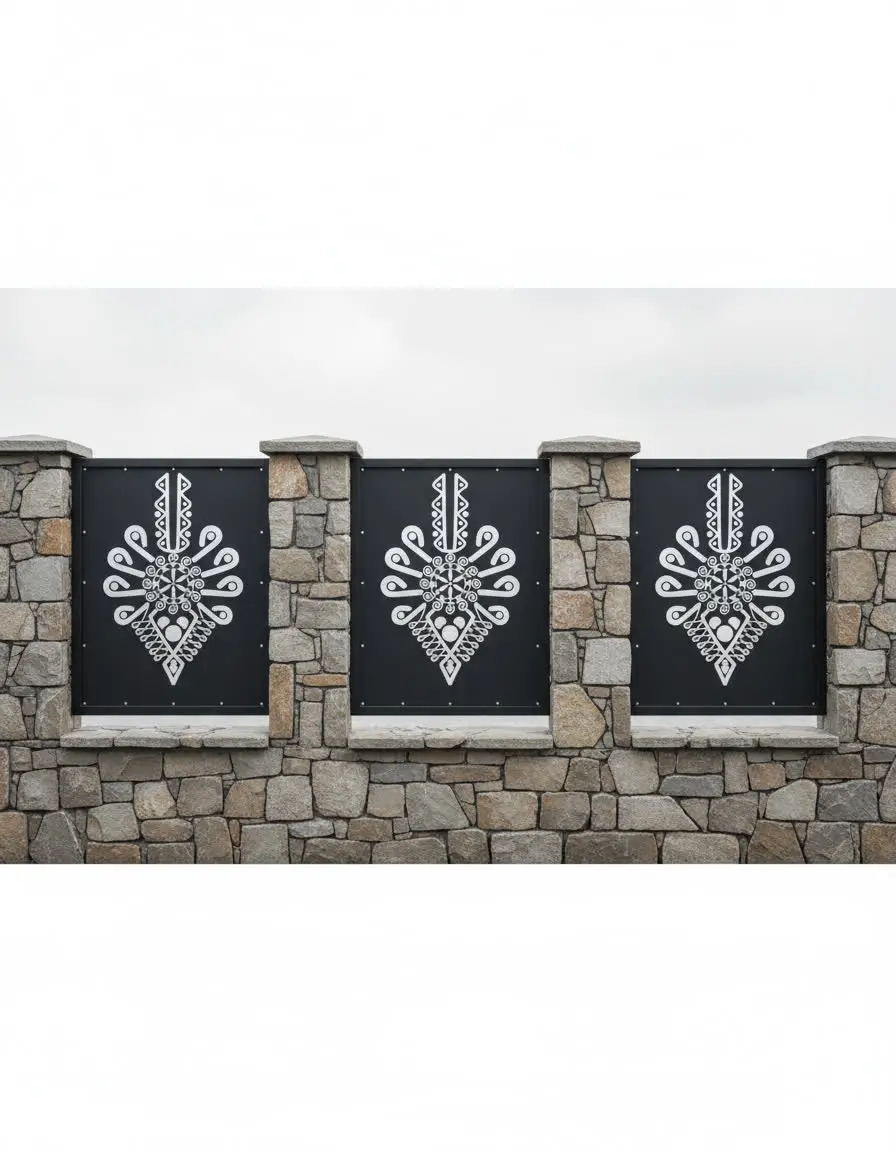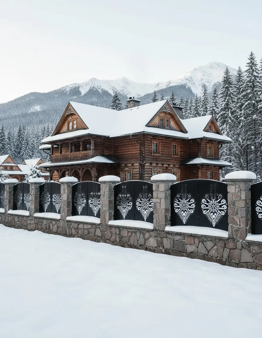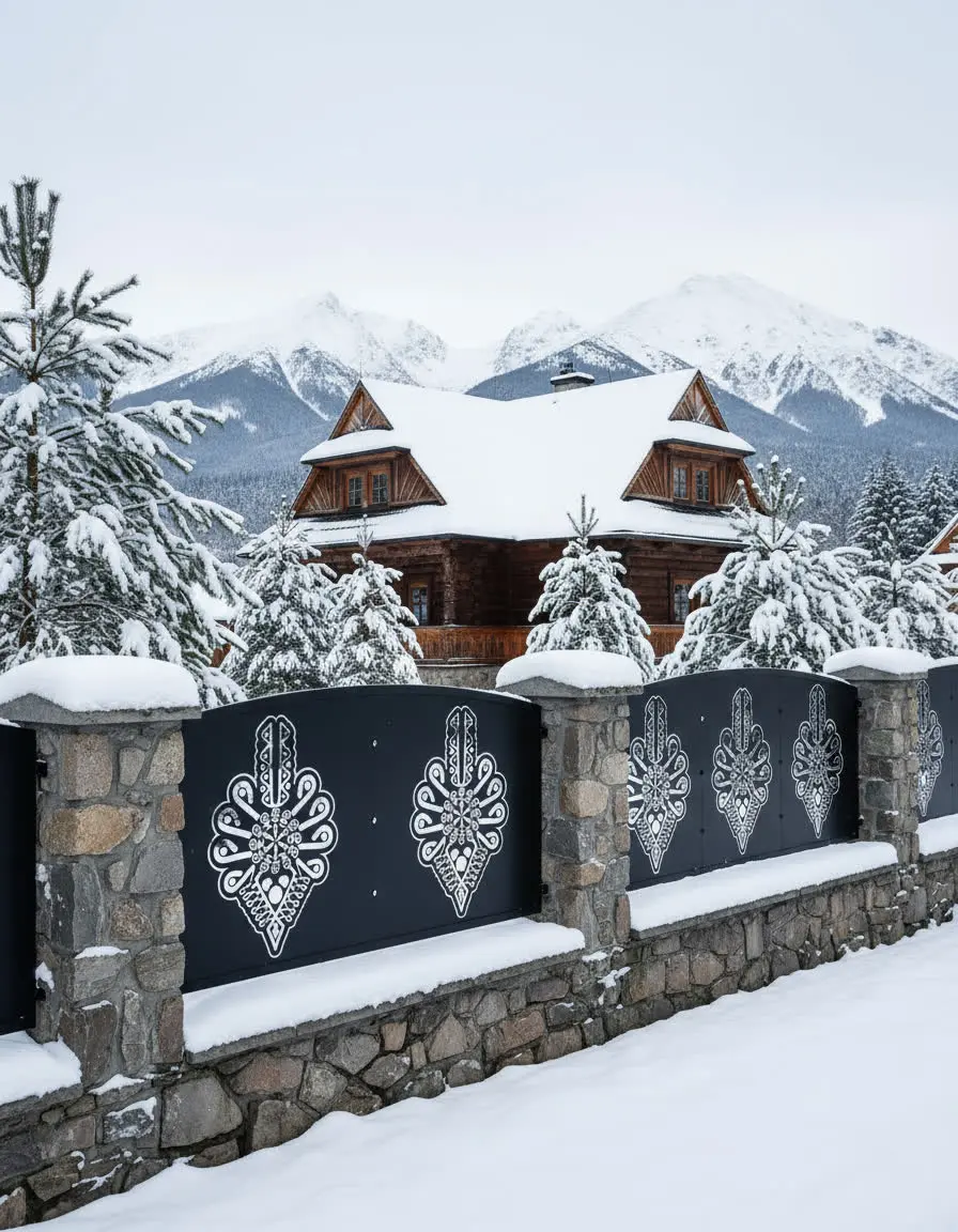 Metalowy panel ogrodzeniowy z tradycyjnym wzorem parzenicy, inspirowany góralskim rzemiosłem. Idealny do połączenia z kamiennym murkiem – nadaje posesji elegancki, regionalny charakter.