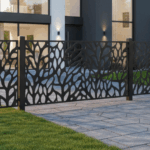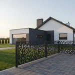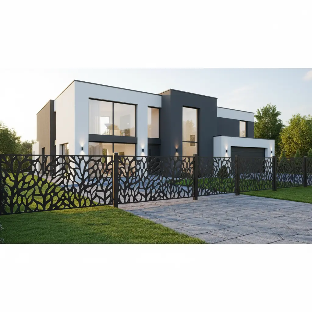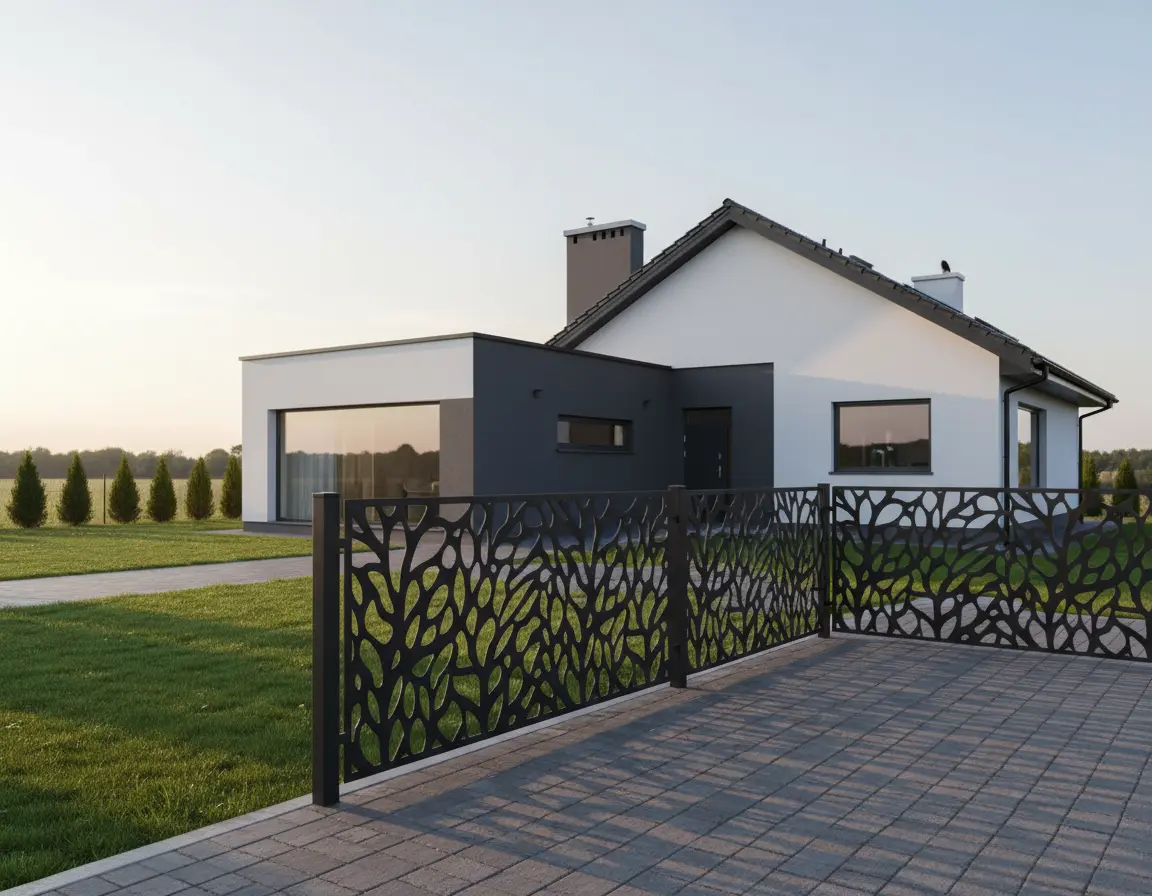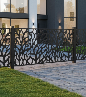 Nowoczesny panel ogrodzeniowy „Botanic Flow” z czarnego, proszkowo malowanego metalu. Ażurowy wzór inspirowany organicznymi kształtami liści nadaje ogrodzeniu elegancki i prestiżowy charakter. Idealny do nowoczesnych posesji i minimalistycznej architektury.
