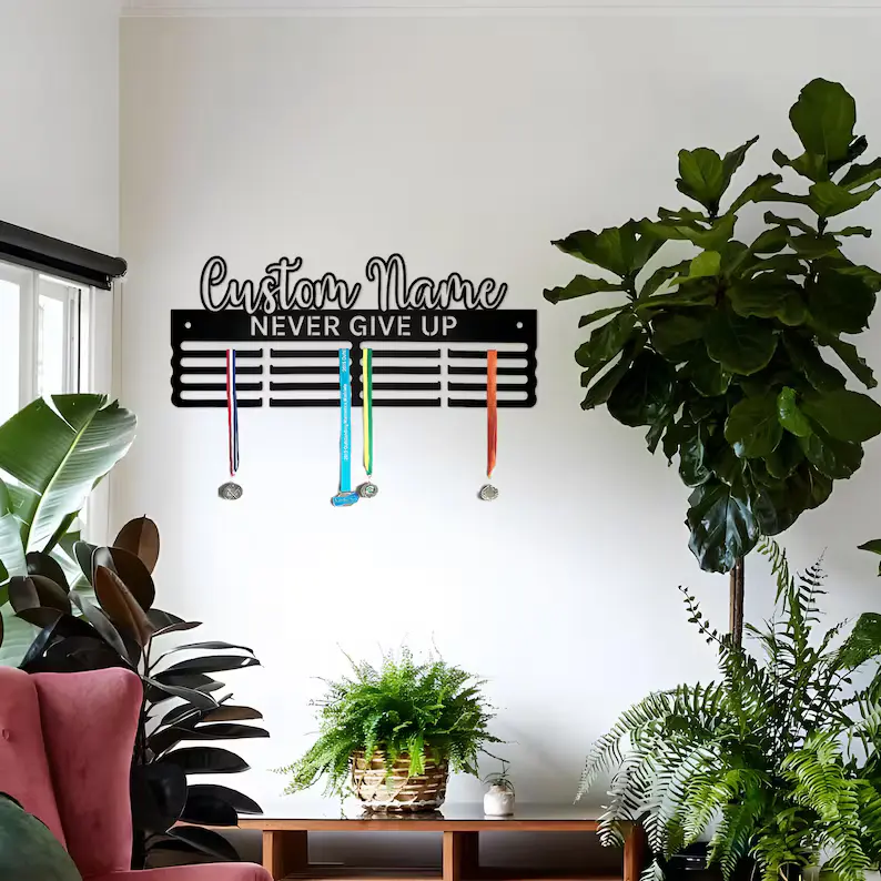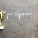 Hasło „Never Give Up” to codzienne przypomnienie o wytrwałości i determinacji. W połączeniu z personalizacją wieszak staje się nie tylko praktycznym miejscem na medale, ale również osobistą pamiątką sportowych sukcesów.