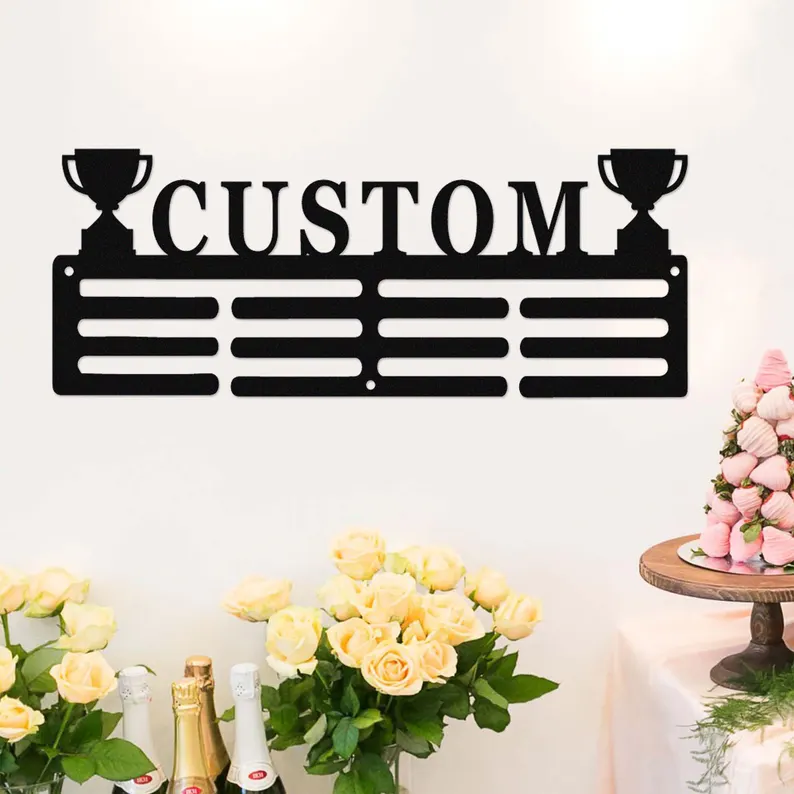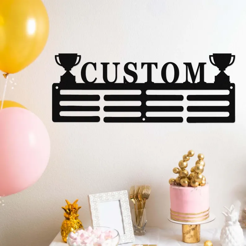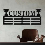 Minimalistyczny personalizowany wieszak na medale, wykonany z metalu i wycinany laserowo.