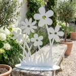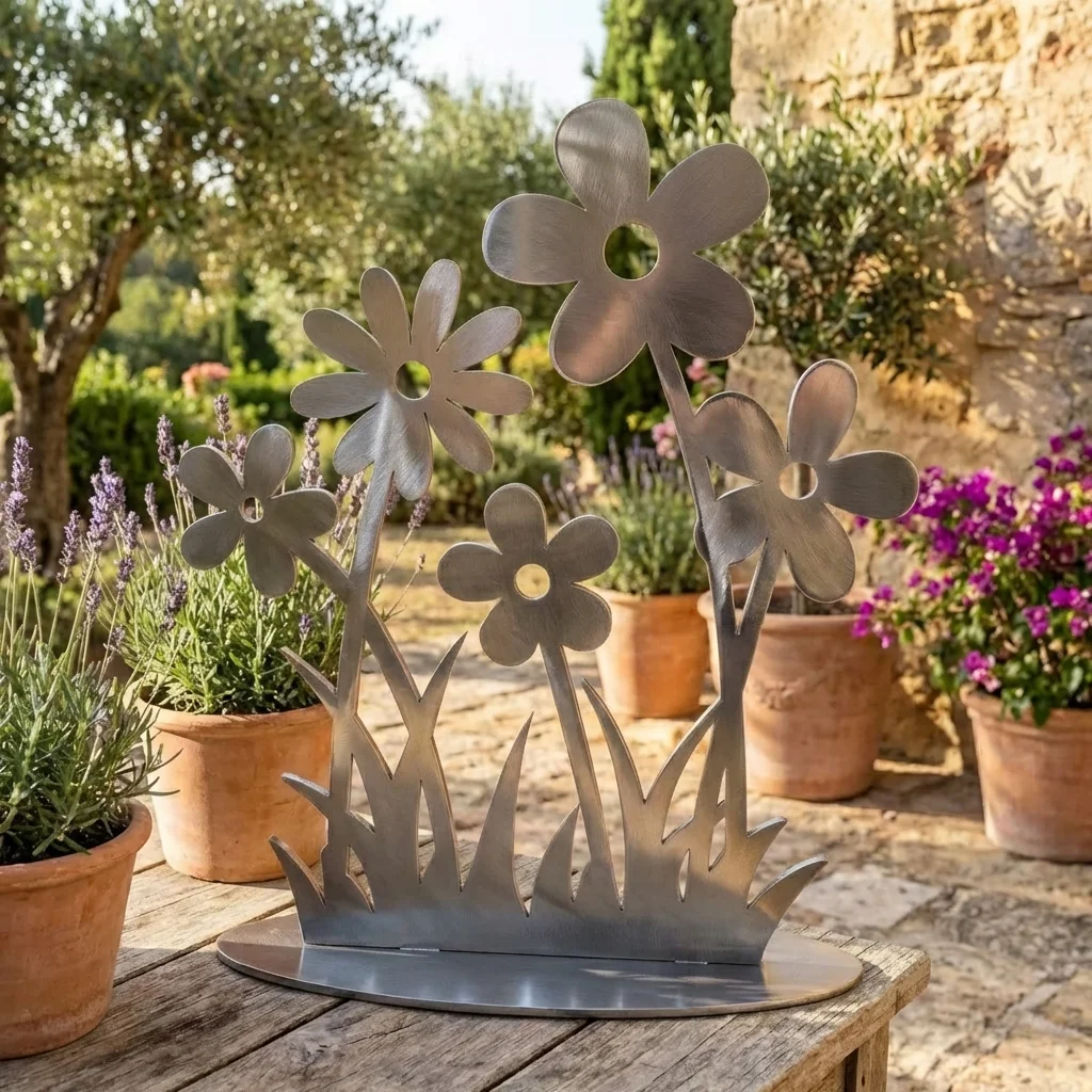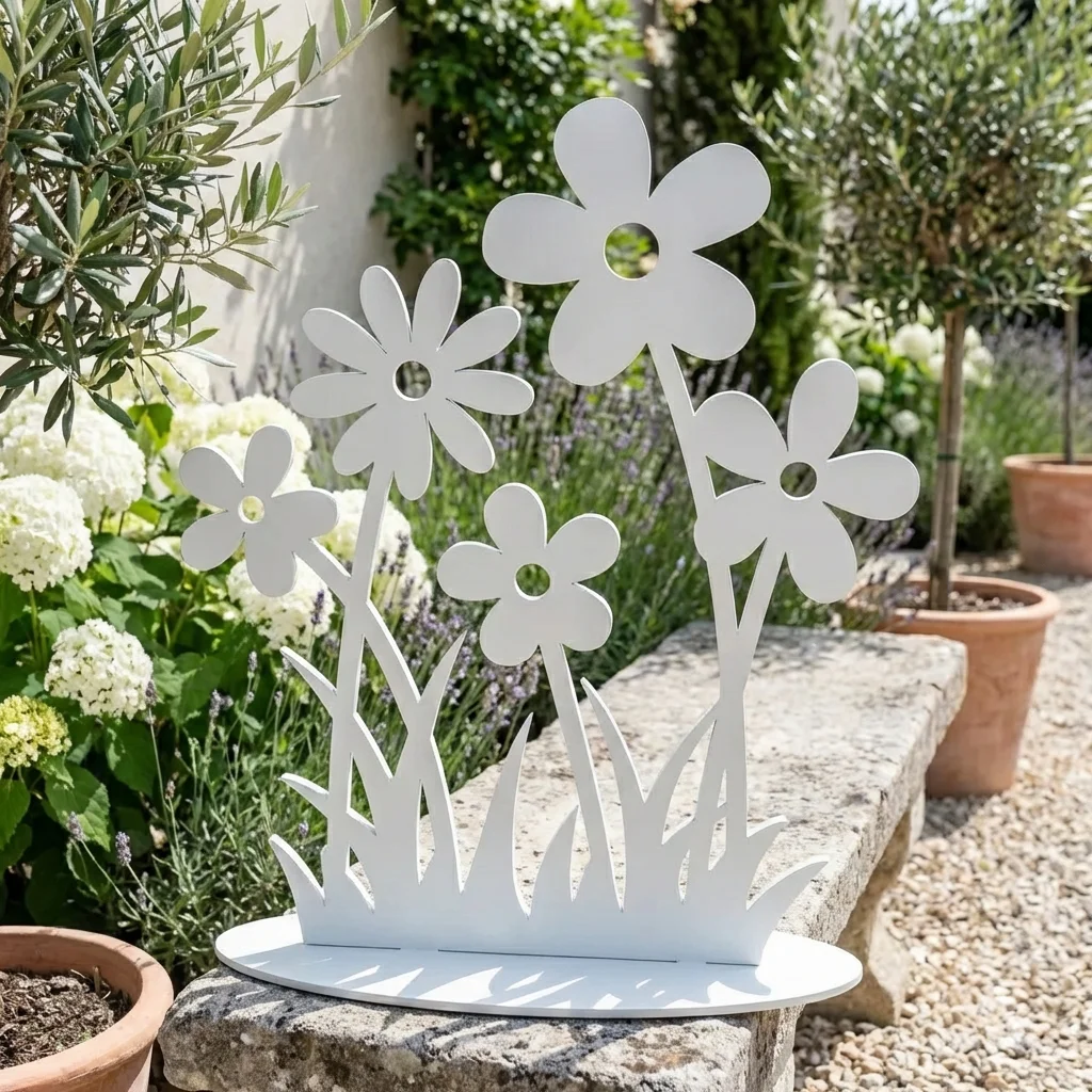 Polne Kwiaty – sylwetka ogrodowa to nowoczesna, ażurowa dekoracja z metalu inspirowana lekką formą łąkowych roślin i minimalistyczną grafiką. Prosta linia kwiatów i traw tworzy elegancki kontrast z zielenią ogrodu oraz kamieniem, doskonale wpisując się w nowoczesne tarasy, patio i strefy wejściowe.