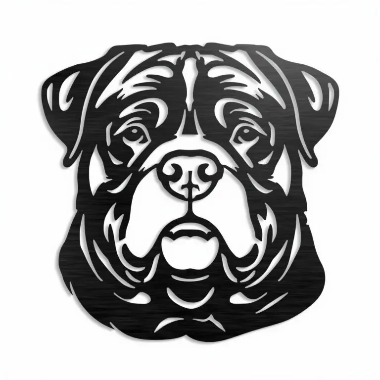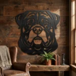 Rottweiler – metalowa dekoracja ścienna w formie głowy psa, wycinana laserowo. Rozmiary: 50×50 lub 80×80 cm. Kolory: Corten, malowany proszkowo (biały/czarny/złoty) lub stal nierdzewna. Do domu i ogrodu.