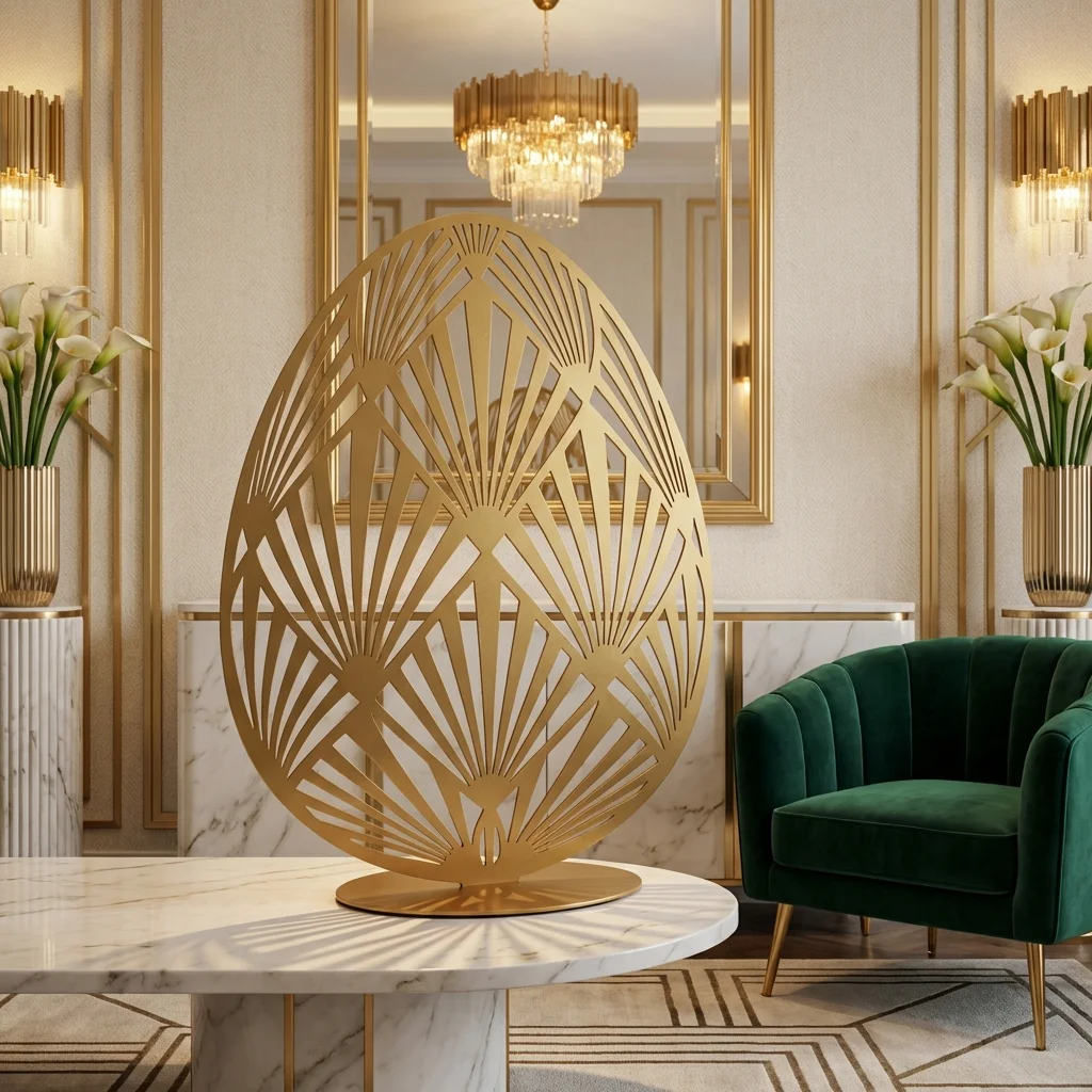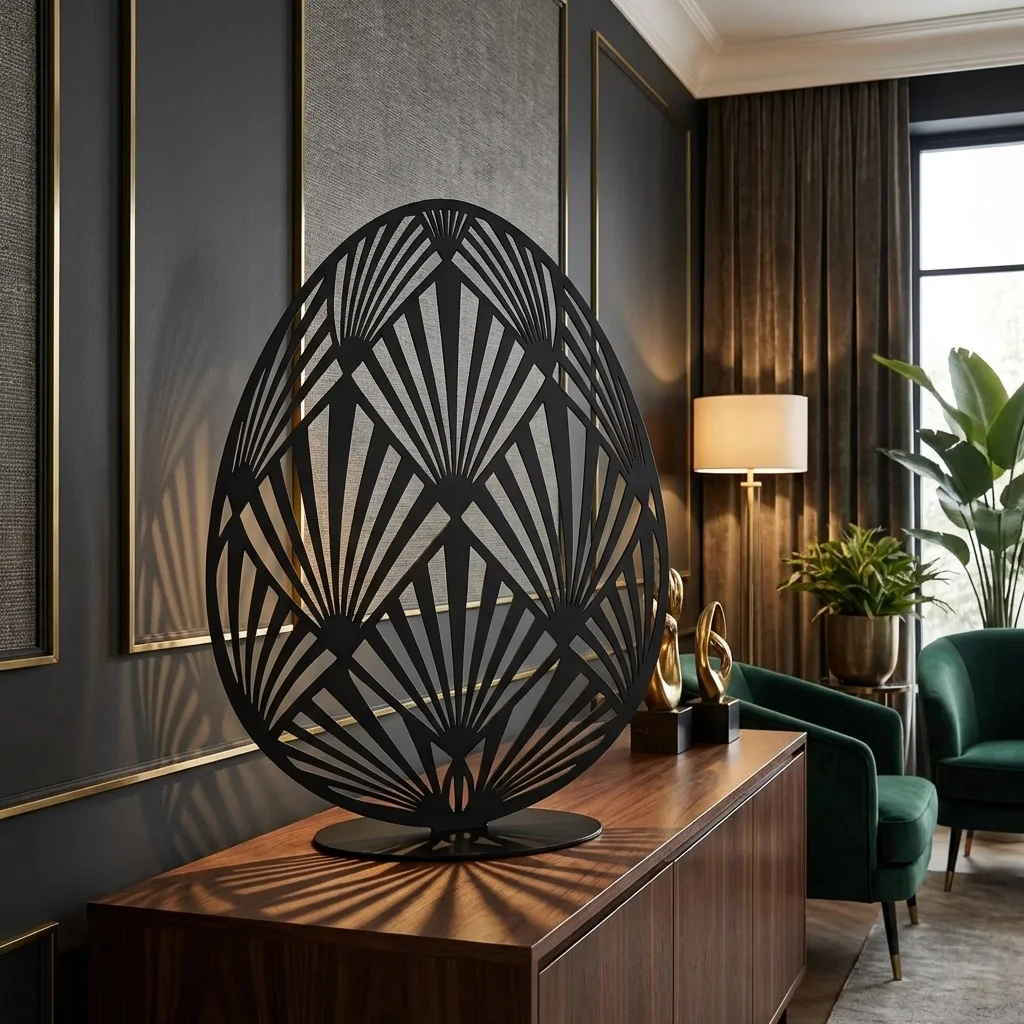 Rzeźba z metalu art deco jajko „Art Deco Jajo” to elegancka, wolnostojąca dekoracja o geometrycznym wzorze inspirowanym stylem art déco. Lekka ażurowa forma pięknie gra światłem i cieniem, dzięki czemu świetnie wygląda na komodzie, konsoli, w salonie, w holu oraz w przestrzeniach premium: hotelach, gabinetach i butikach.