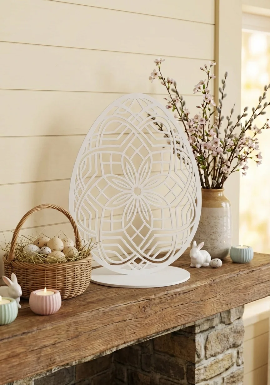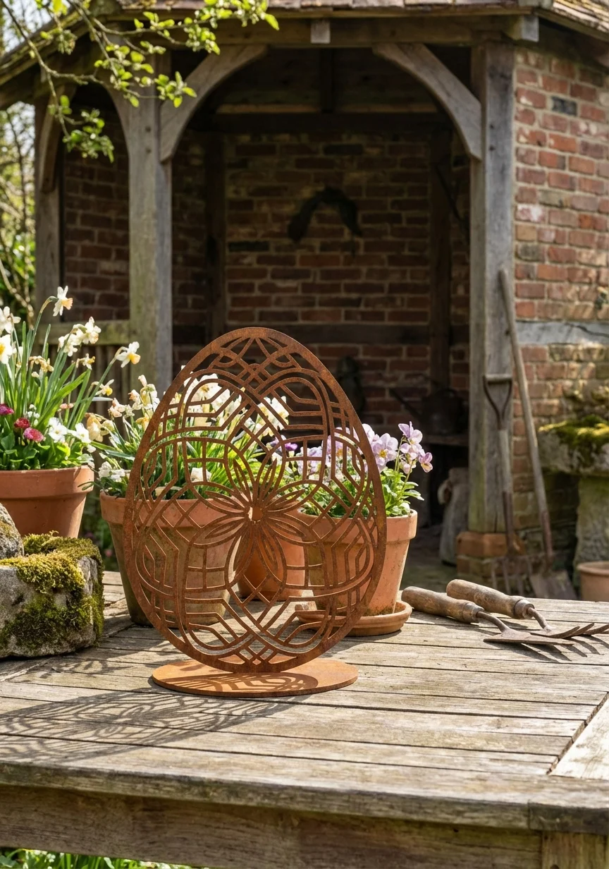 Rzeźba z metalu jajko „Królewskie Jajo” – luksusowa, wolnostojąca dekoracja z mandalowym, symetrycznym ornamentem w stylu królewskim. Idealna do salonu, gabinetu, hoteli i przestrzeni premium oraz jako elegancka dekoracja wielkanocna. Rozmiary: 11×15 cm, 15×20 cm, 18×25 cm. Wykończenia: corten (rdzawy), czarny, biały, złoty lub stal nierdzewna polerowana/szczotkowana. Darmowa dostawa na terenie Polski.
