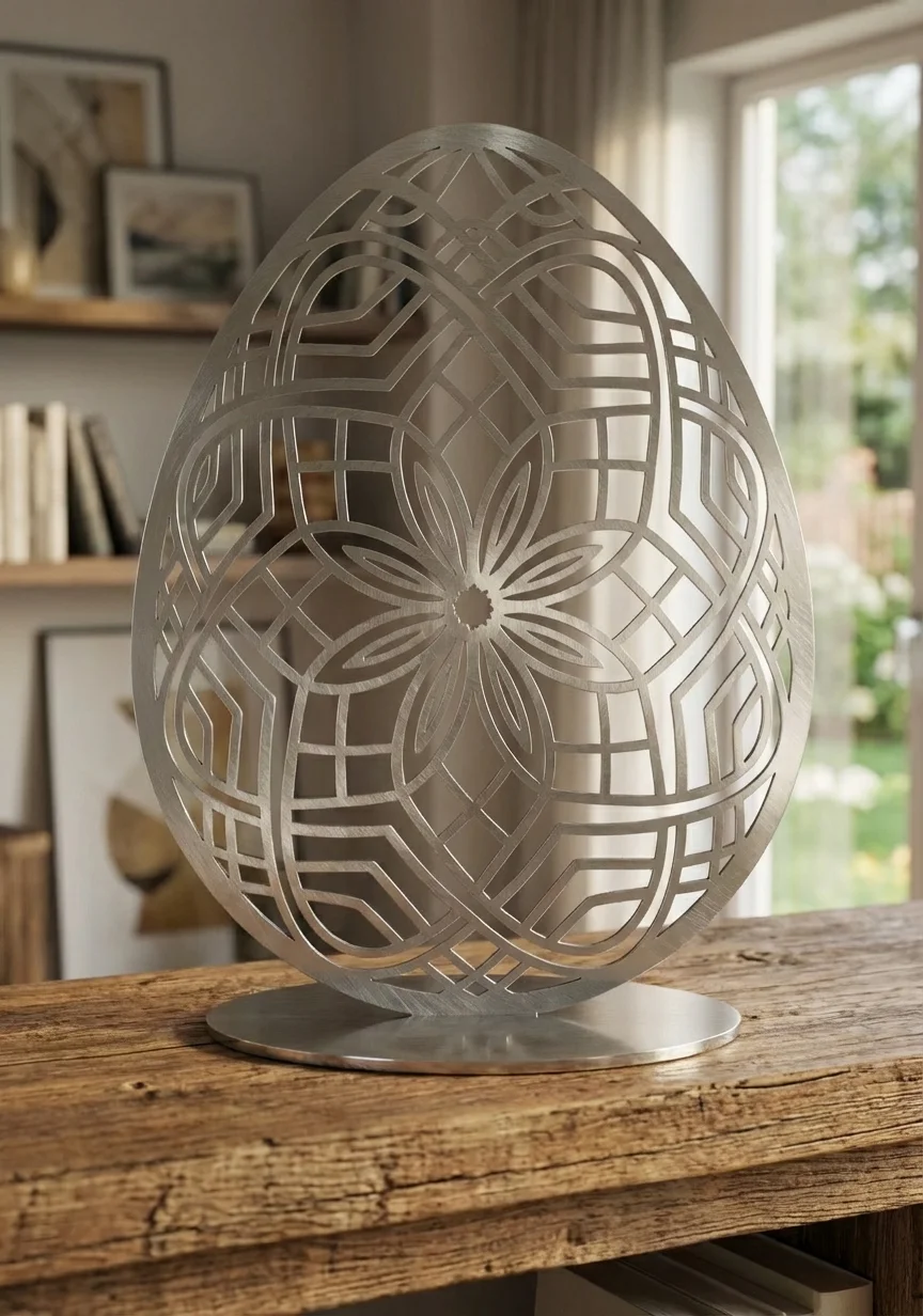 Rzeźba z metalu jajko „Królewskie Jajo” to luksusowa, wolnostojąca dekoracja o symetrycznym, mandalowym wzorze inspirowanym królewską ornamentyką i sztuką klasyczną. Ażurowa forma pięknie gra światłem i cieniem, tworząc efekt eleganckiego eksponatu – idealnego do salonu, gabinetu, biblioteki, recepcji hotelowej lub przestrzeni premium.