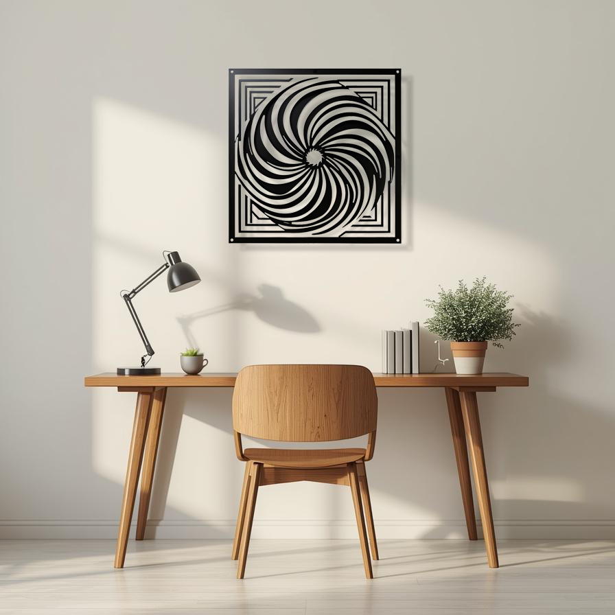 Nowoczesne metalowe dekoracje ścienne z motywem spiral i wirów. Dynamiczne, geometryczne wzory nadają wnętrzu energii i niepowtarzalnego charakteru.