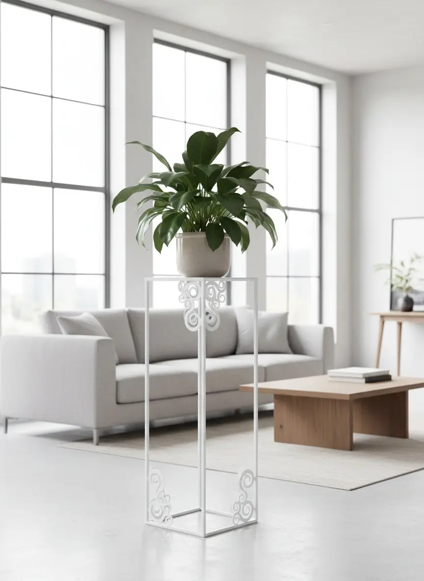 Ażurowe zdobienia w rogach nadają mu artystycznego charakteru i sprawiają, że stojak sam w sobie jest dekoracją. Stabilna konstrukcja gwarantuje bezpieczeństwo rośliny, a minimalistyczny design pozwala wkomponować go zarówno w nowoczesne, jak i klasyczne aranżacje.
