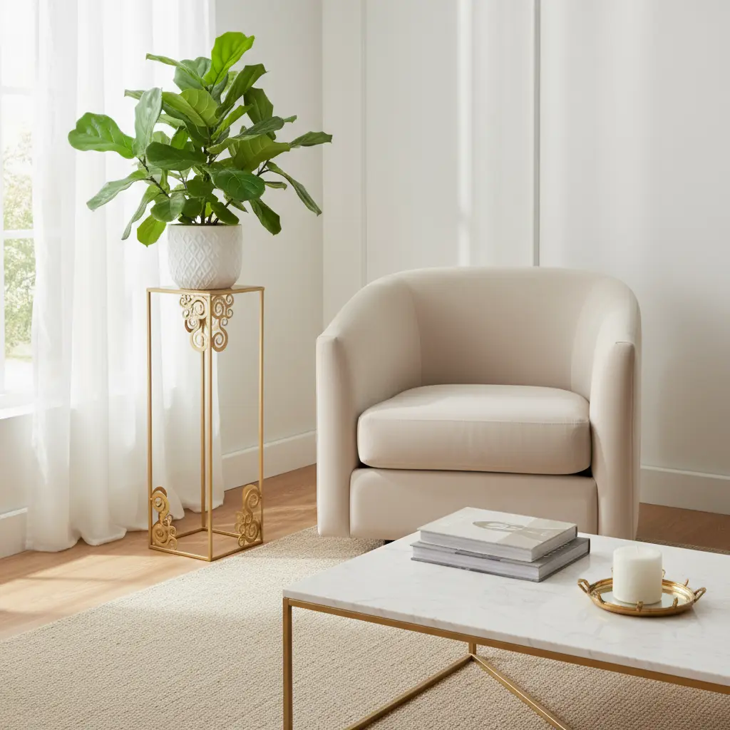 Elegancki stojak metalowy na kwiaty w złotym kolorze, ozdobiony dekoracyjnymi motywami w narożnikach. Idealny do salonu, gabinetu czy sypialni, dodaje wnętrzu luksusu i stylu.