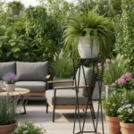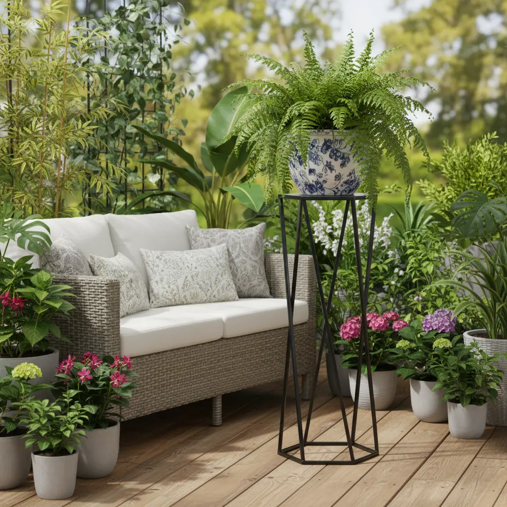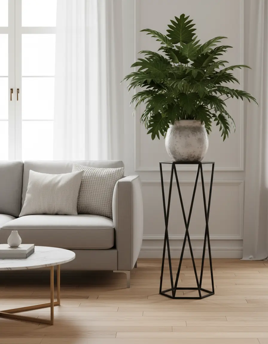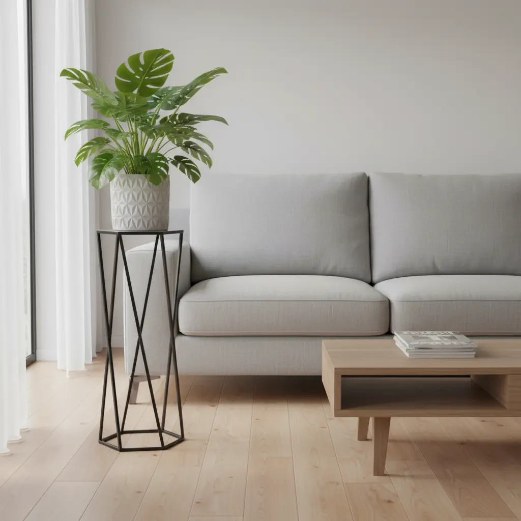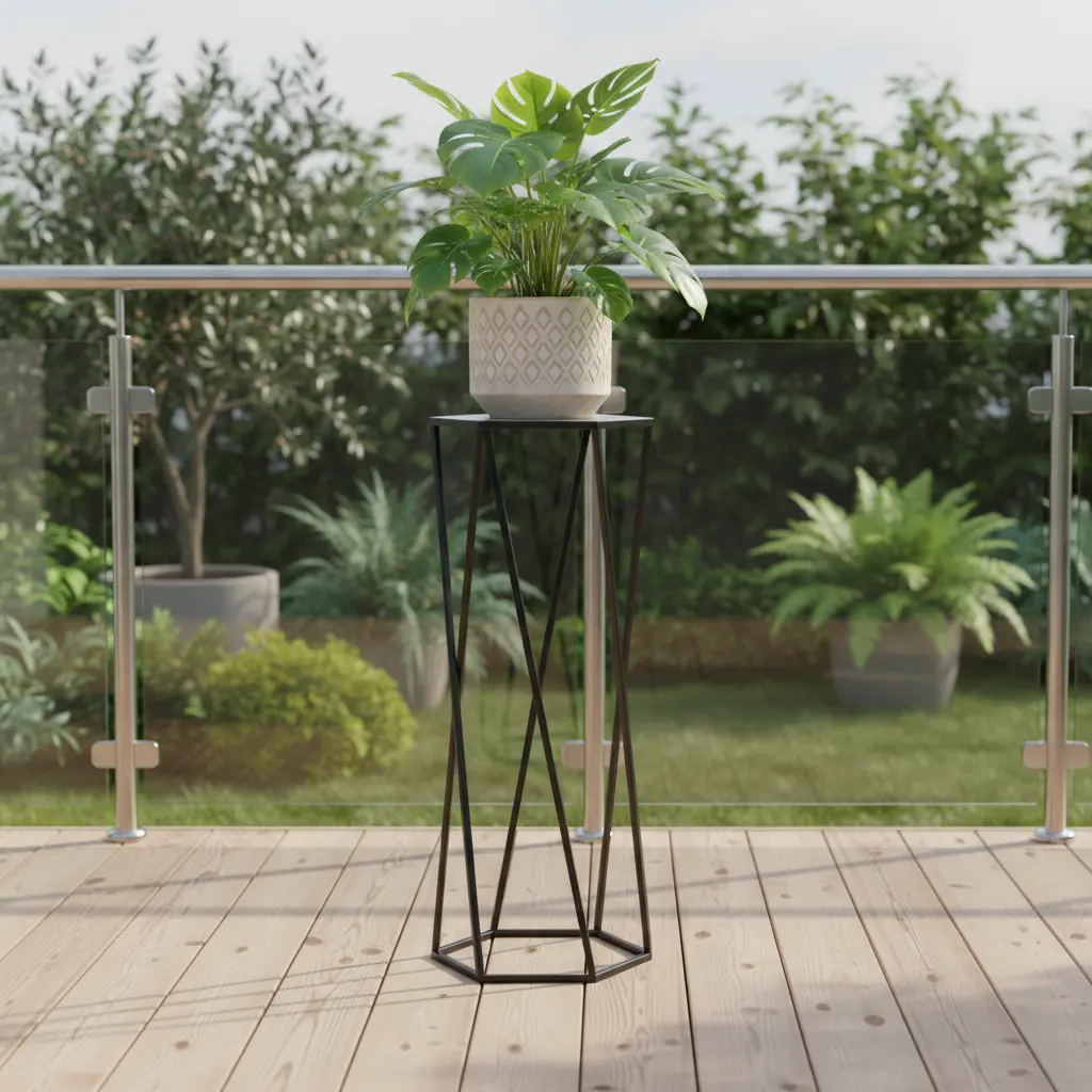 Elegancki stojak metalowy na kwiaty w kształcie sześciokąta, który łączy nowoczesny design z funkcjonalnością. Idealny do salonu, biura czy na taras.