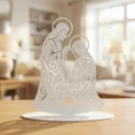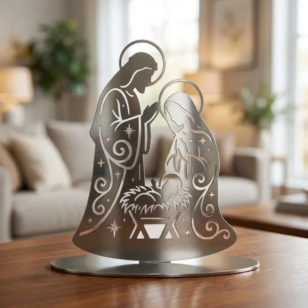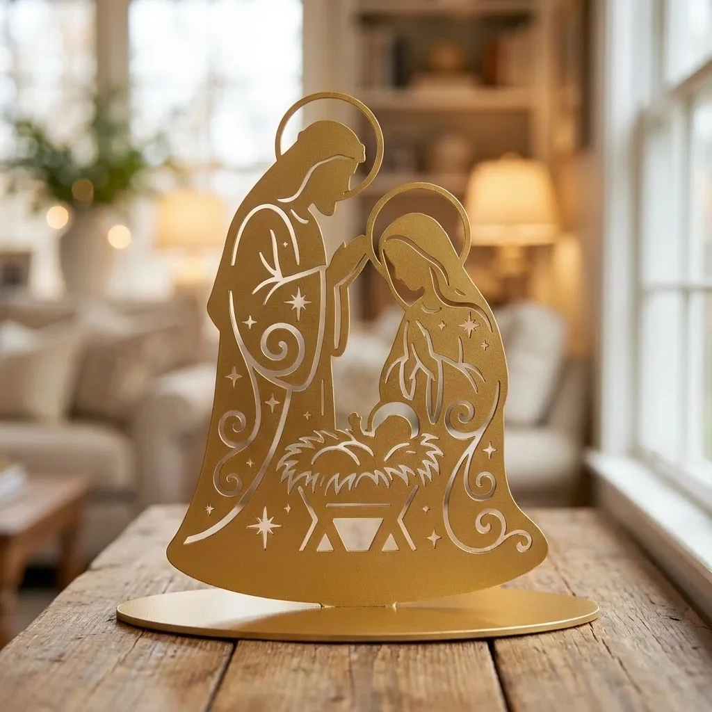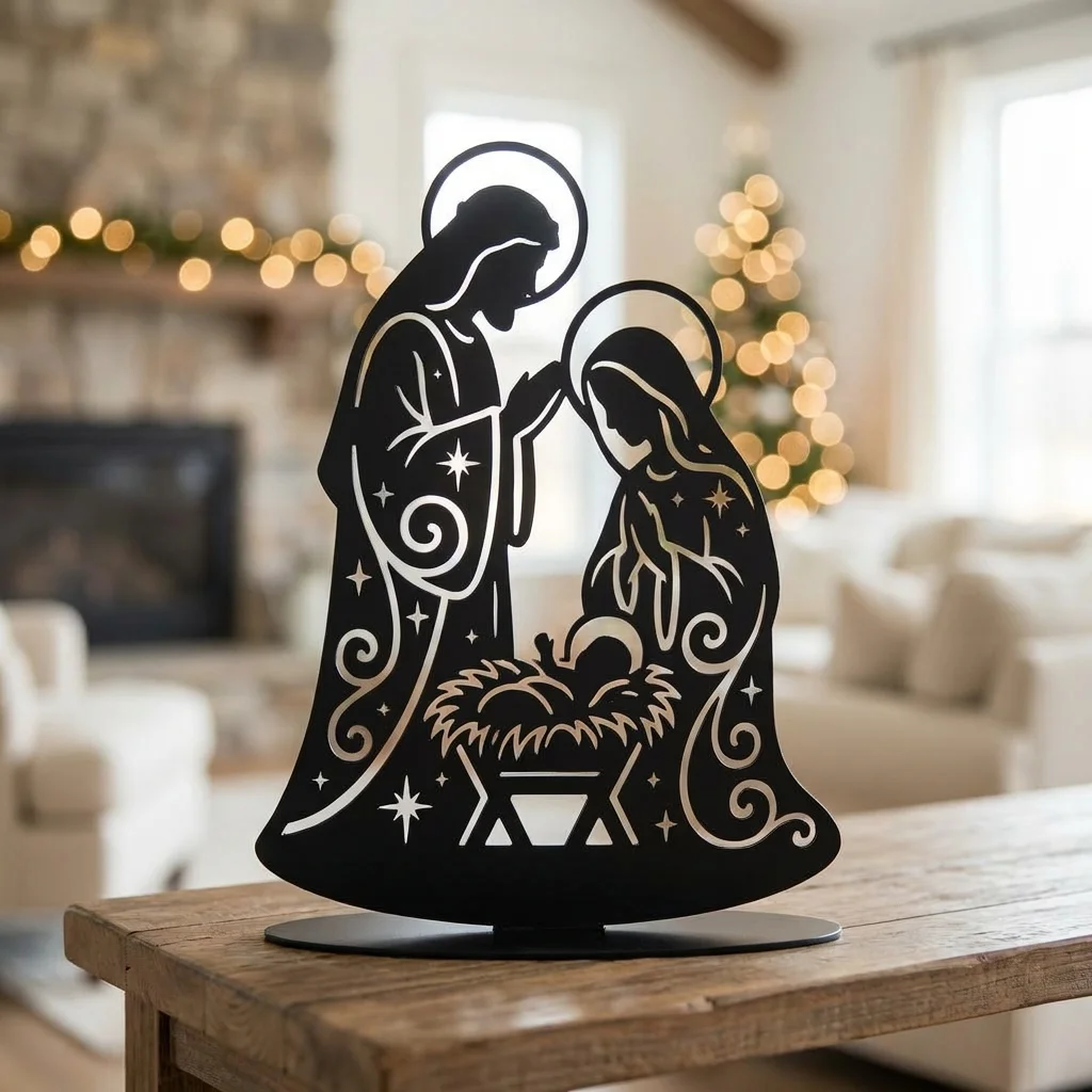 Święta Rodzina Betlejem – metalowa dekoracja wolnostojąca to wyjątkowa ozdoba sakralna inspirowana sceną narodzenia. Motyw Świętej Rodziny przy żłóbku wnosi do wnętrza ciepło, spokój i świąteczny, duchowy charakter, a elegancka forma wycinana z metalu sprawia, że dekoracja pięknie prezentuje się na komodzie, półce, konsoli lub stole.