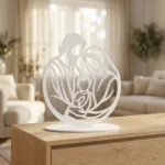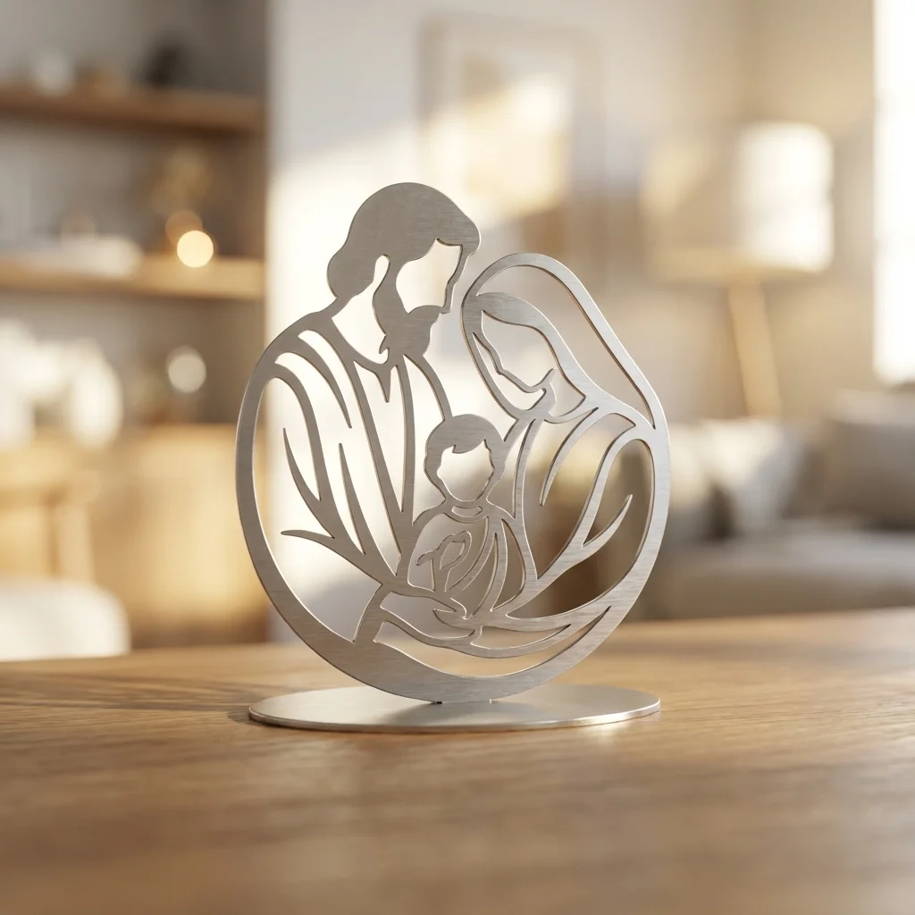 Święta Rodzina Bliskości – metalowa dekoracja wolnostojąca to elegancka ozdoba sakralna w nowoczesnym, minimalistycznym wydaniu. Prosta, harmonijna linia Maryi, Józefa i Dzieciątka tworzy kompozycję pełną ciepła, spokoju i rodzinnej bliskości, dzięki czemu dekoracja pięknie prezentuje się na komodzie, półce, konsoli lub w domowym kąciku modlitwy.