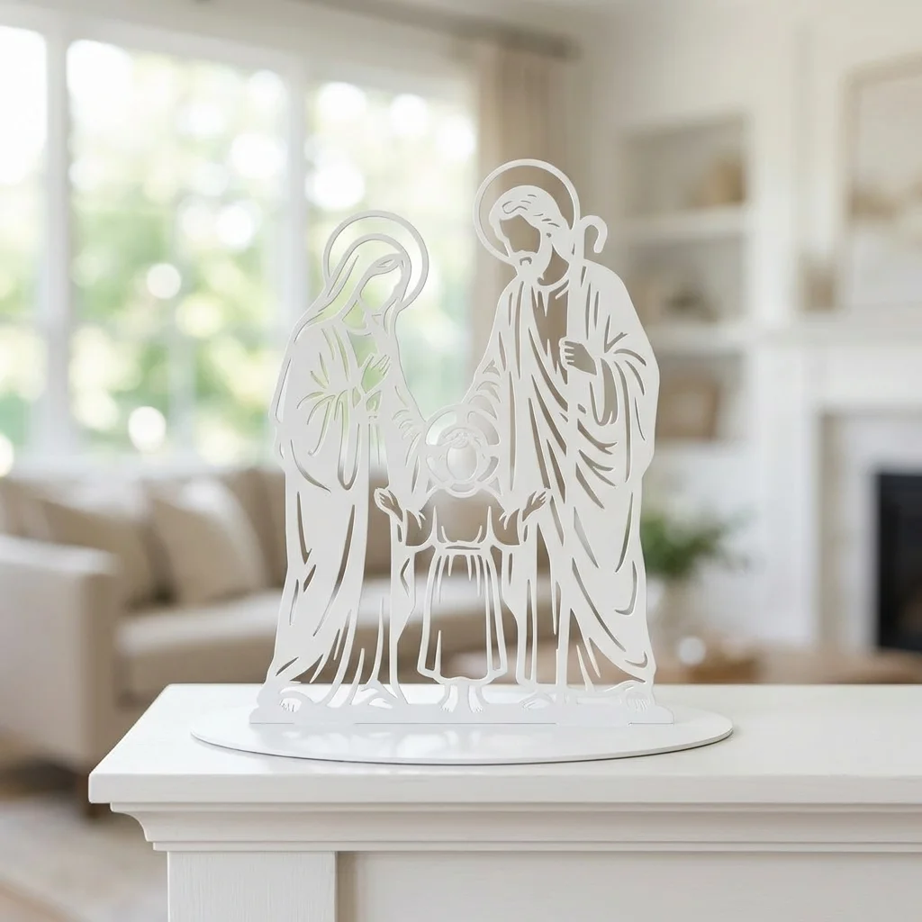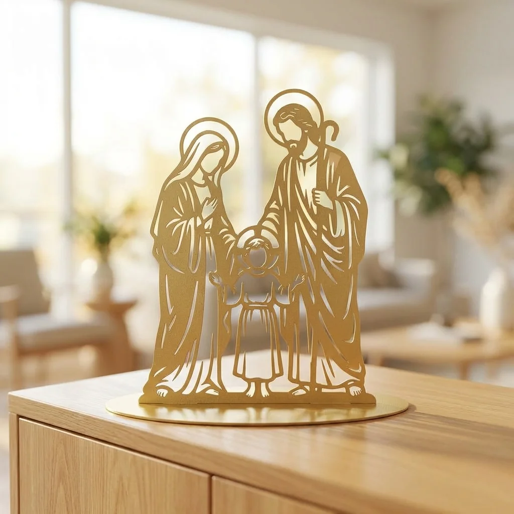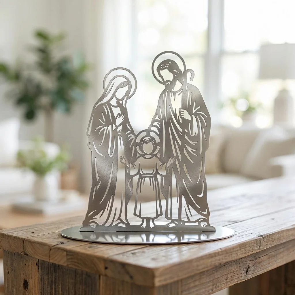 Święta Rodzina Opieki – metalowa dekoracja wolnostojąca to elegancka ozdoba sakralna przedstawiająca Maryję, Józefa i Dzieciątko w pełnej spokoju, rodzinnej kompozycji. Motyw opieki i bliskości nadaje dekoracji wyjątkowo ciepły charakter, dzięki czemu pięknie prezentuje się na komodzie, półce, konsoli lub w domowym kąciku modlitwy.