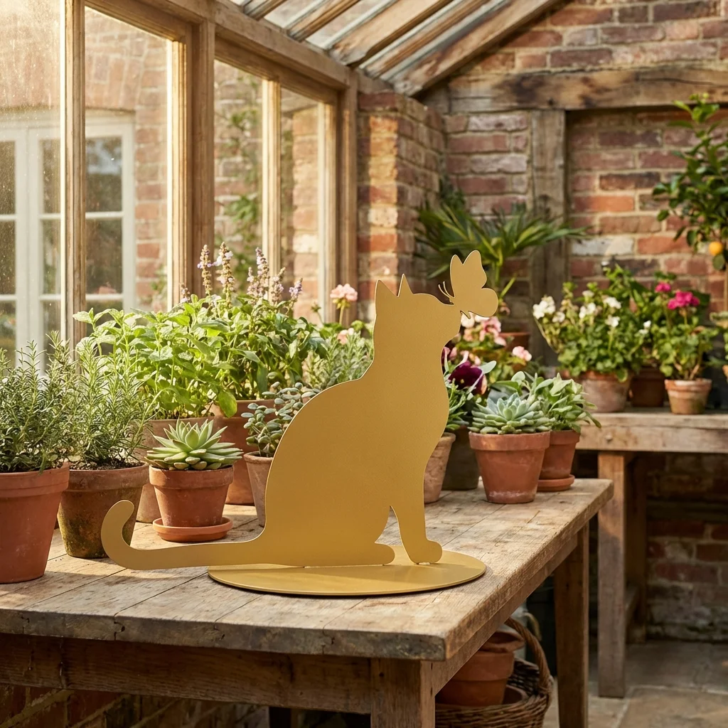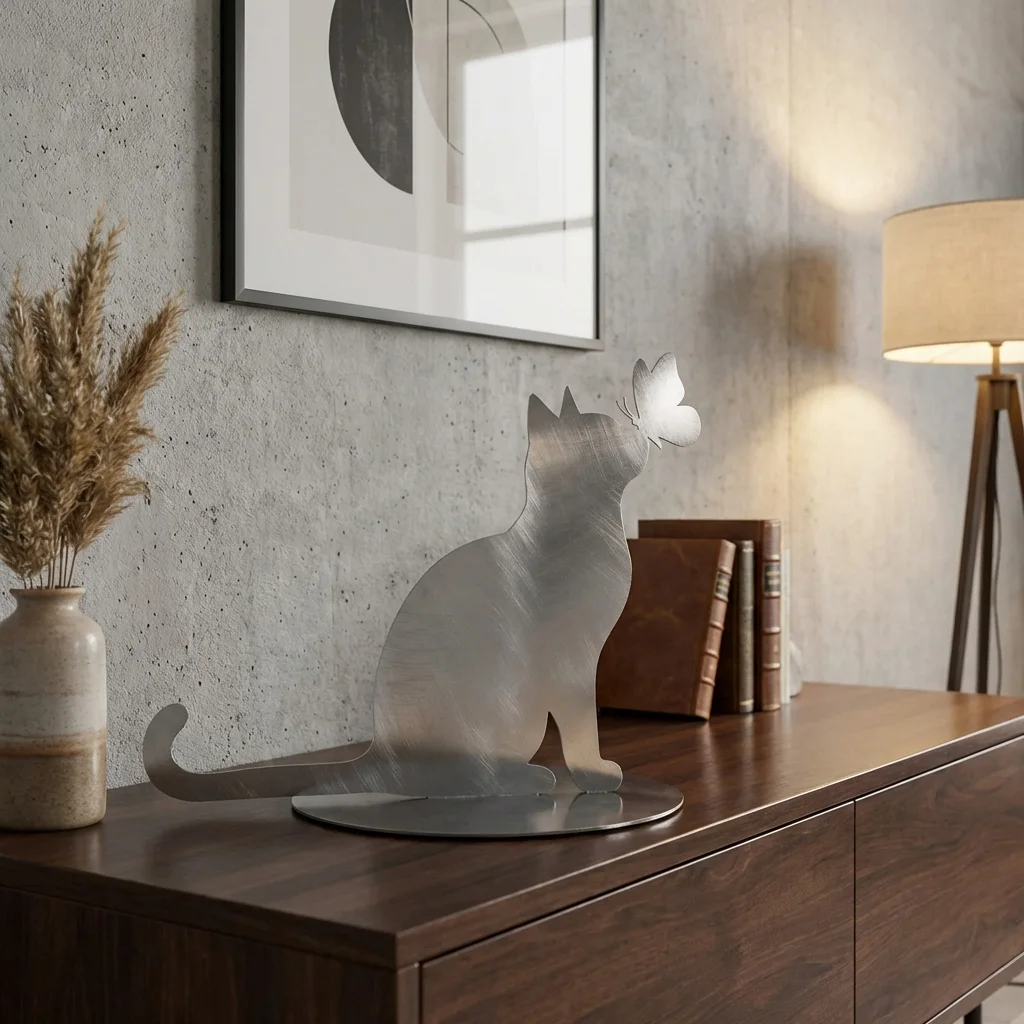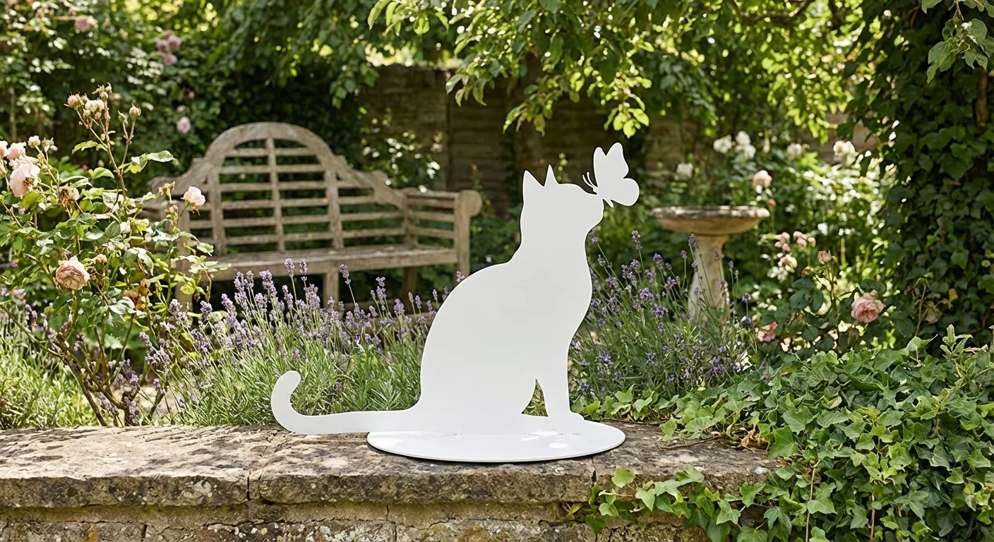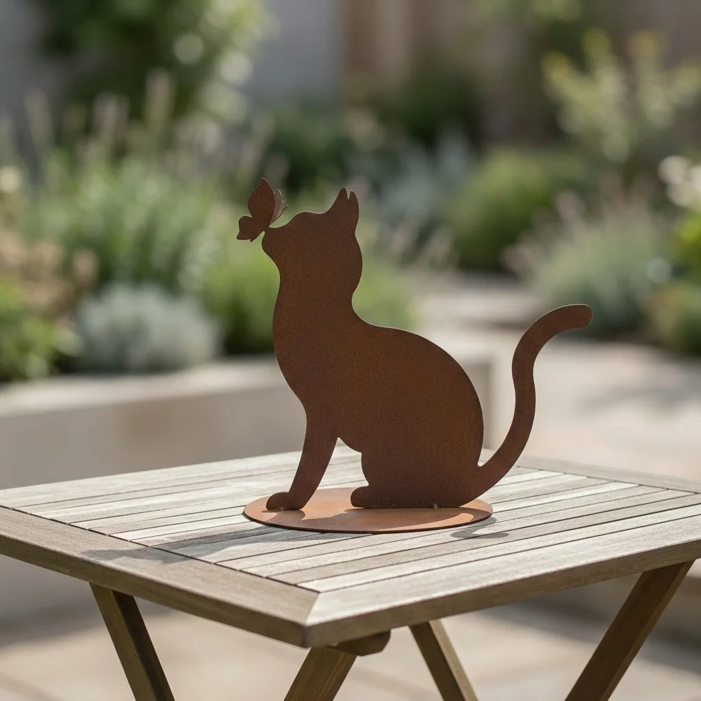 Wiosenny Kot – sylwetka ogrodowa to minimalistyczna dekoracja z metalu przedstawiająca kota w spokojnej pozie, z motywem motyla przy pyszczku. Prosta forma świetnie wpisuje się w nowoczesne tarasy, ogrody i strefy wypoczynku, dodając aranżacji lekkości, elegancji i wiosennego akcentu.