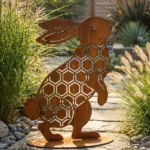 Zając Światła to wolnostojąca sylwetka geometryczna z ażurowym wzorem heksagonów, która efektownie gra światłem i cieniem. Idealna do wnętrz premium (salon, gabinet, recepcja) oraz do zadaszonych stref tarasu. Rozmiary: 13,5×20 cm, 20×30 cm, 27×40 cm. Warianty: corten, czarny, biały, złoty lub stal nierdzewna (polerowana/szczotkowana). Darmowa dostawa na terenie Polski.
