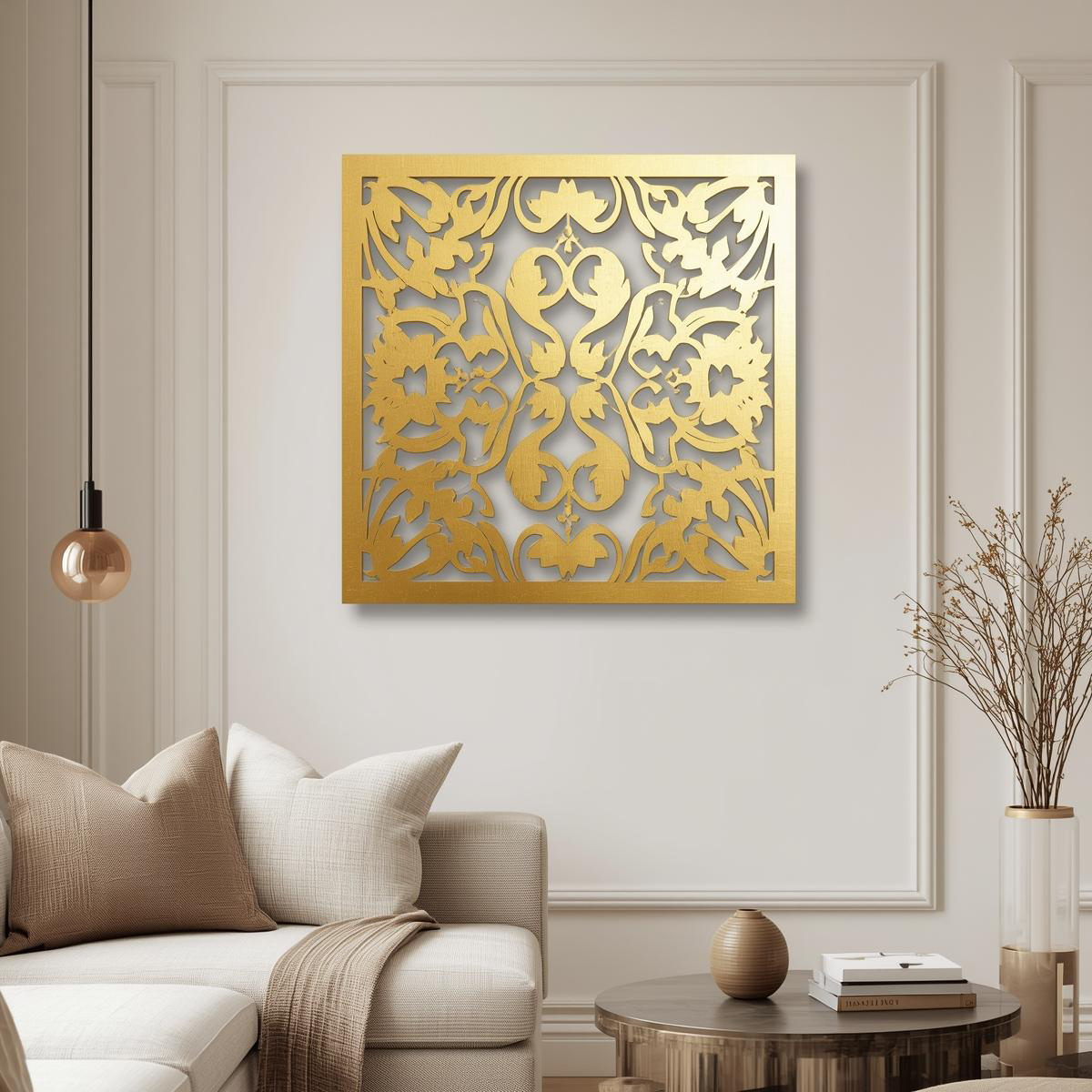 Panel dekoracyjny „Złota Arabeska” to propozycja dla miłośników klasycznych, ornamentalnych wzorów w eleganckiej odsłonie. Symetryczny motyw roślinny, inspirowany arabeskami, został precyzyjnie wycięty laserowo w metalu, a złote wykończenie nadaje mu wyjątkowego charakteru i luksusowego wyglądu.