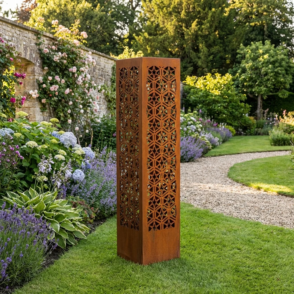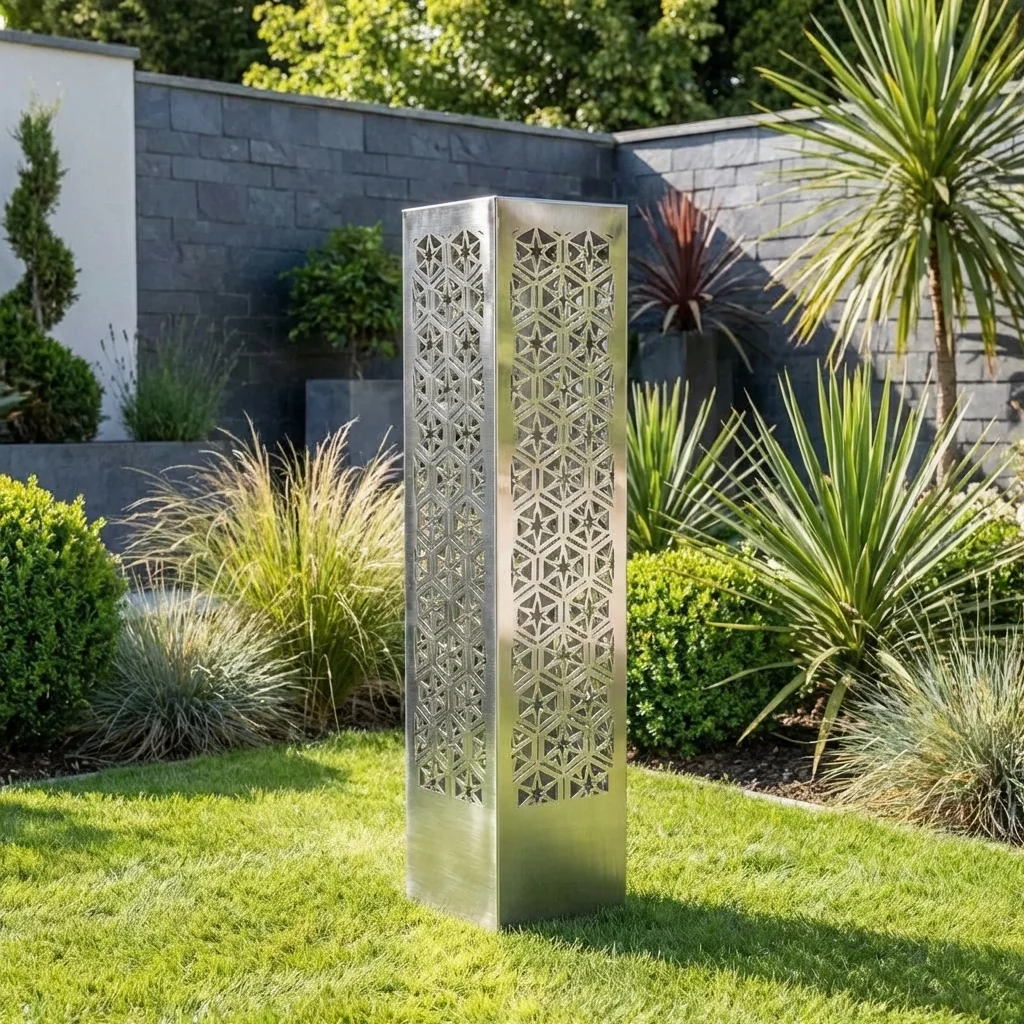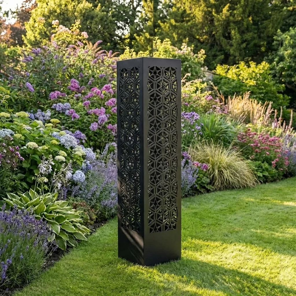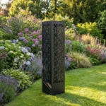 „Złota Mozaika” to metalowa kolumna ogrodowa z geometrycznym, ażurowym wzorem inspirowanym architekturą fasad – nowoczesny, reprezentacyjny akcent do ogrodu, tarasu i stref wejściowych. 4 rozmiary: 15×15×40, 20×20×70, 25×25×90, 25×25×110 cm. 5 wariantów kolorystycznych: corten (rdzawy), czarny, biały, złoty, stal polerowana/szczotkowana. Darmowa dostawa.