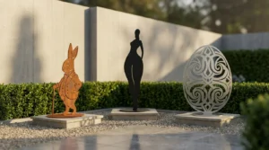 W aranżacjach ogrodowych krzyż często wygląda bardzo spójnie z innymi metalowymi elementami: donicami metalowymi, panelami dekoracyjnymi i lampionami dekoracyjnymi.